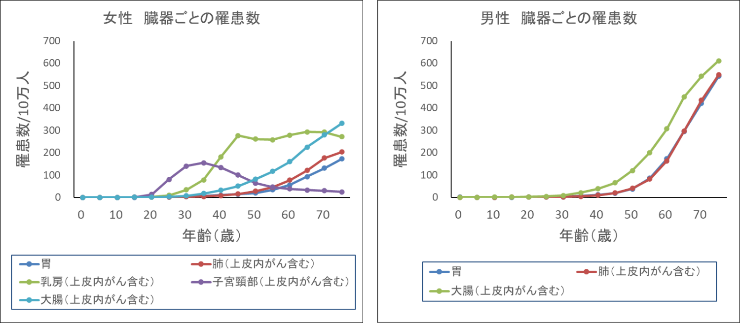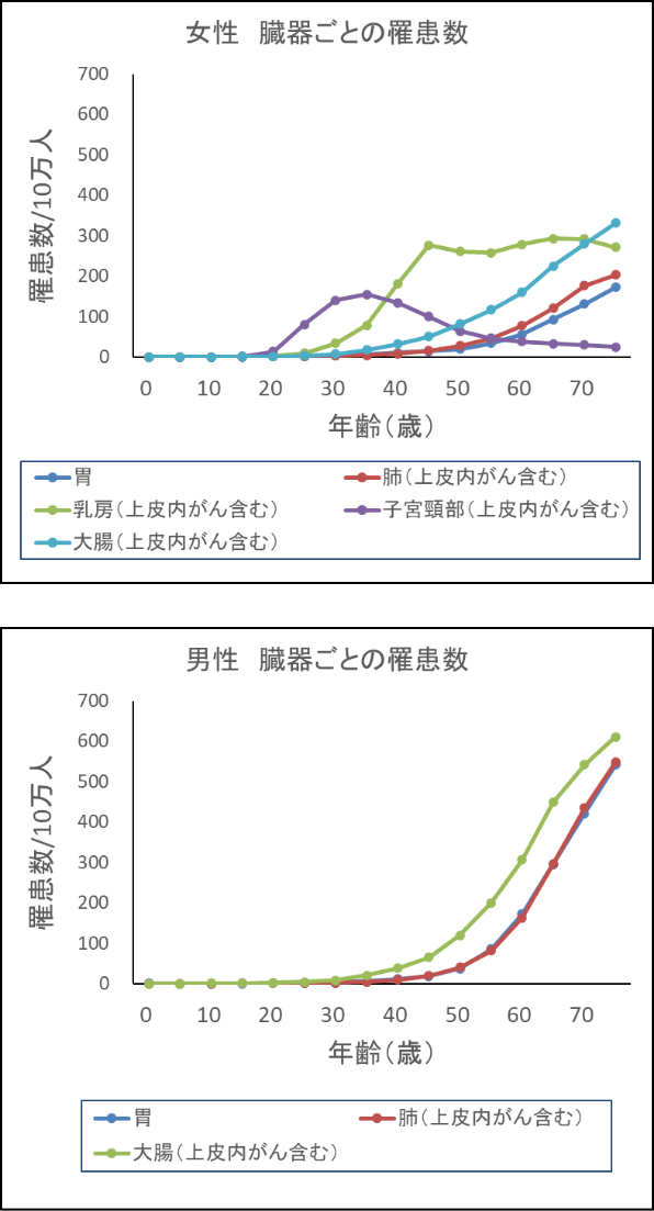 ・一方、胃がん、肺がん、大腸がん40歳はまでは発症例少ない